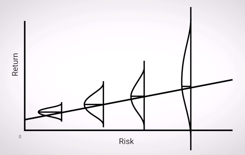 Risk is measured in the theory as variance of returns, Var(R). Variance simply measures the spread of returns and gives academics an easy number to work with. But spread of returns (a.k.a volatility) isn’t really what people think about when they refer to risk. If it is, it isn’t what they mean deep down. Investors don’t demand higher returns from an asset just because it has a higher spread of returns. A higher spread could be biased to higher returns, it could be biased to lower returns. This can be visualised by adding skewness to the vertical distributions in Figure 2. It is clear that the direction of such bias (which we can measure with second order moment, kurtosis) is what investors really care about.1 They demand higher returns because they risk losing money.2 This is what truly drives the risk-return relationship.
